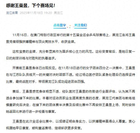 开赛前王曼昱身体已出现反应。在11月18日进行的女子团体四分之一决赛中,王曼昱在与江苏队队员钱天一的关键对决时颈部不适。经过场边医疗团队紧急处理后仍选择坚持比赛,最终战胜对手,带领黑龙江队成功闯进团体四强。赛后,王曼昱感觉身体明显不适,经队医对王曼昱的伤势进行全面评估,认为其不再适合参加接下来的比赛。本着对运动员职业生涯高度负责的态度,黑龙江代表团与教练组慎重研究后决定,在接下来的团体赛半决赛及后续比赛中不再安排王曼昱上场,同时安排她返回北京进行进一步检查与康复。