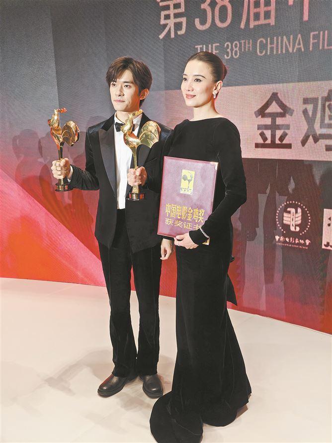 最佳男主角易烊千玺和最佳女主角宋佳合影。(厦门日报记者 薛尧 摄)