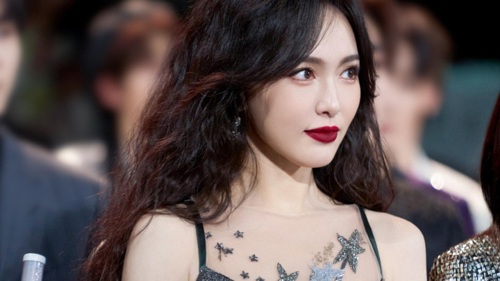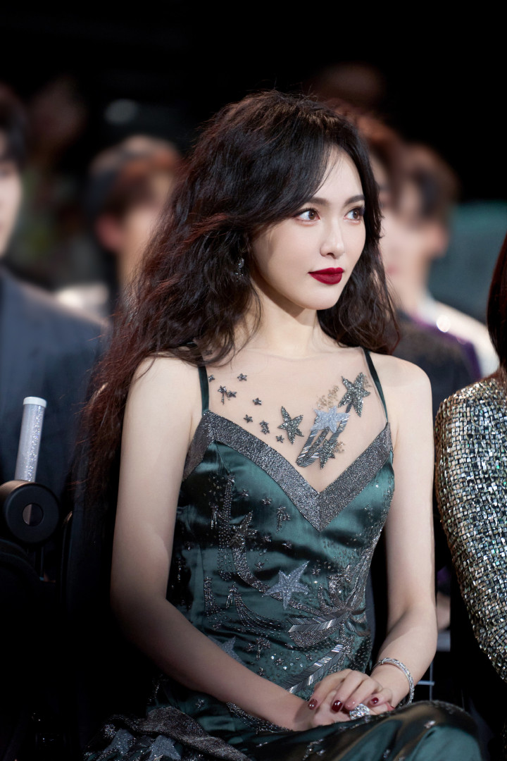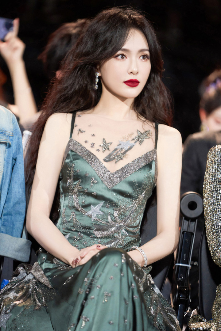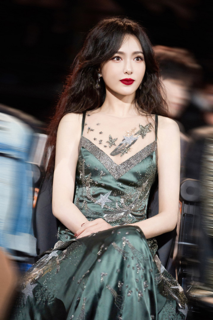 唐嫣星光纱裙坠入凡间!吊带微卷发撩碎星河,浓颜红唇一眼万年