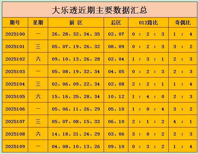 大乐透上期开期奖号为:04 08 10 13 26,后区09 10;012路比0 : 3 : 2,奇偶比1 : 4。