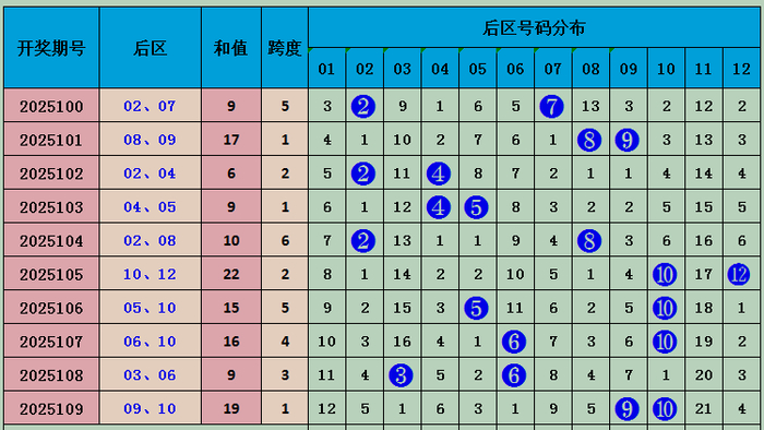 后区分析:上期后区开出09 10,和值19,较上期和值上升,本期预计和值会下降,看好号码03 07,和值10。