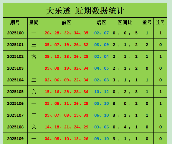 大乐透上期开出奖号:04 08 10 13 26 +09 10,区间比是3 : 1 : 1,没有开出连号,没有开出重号。