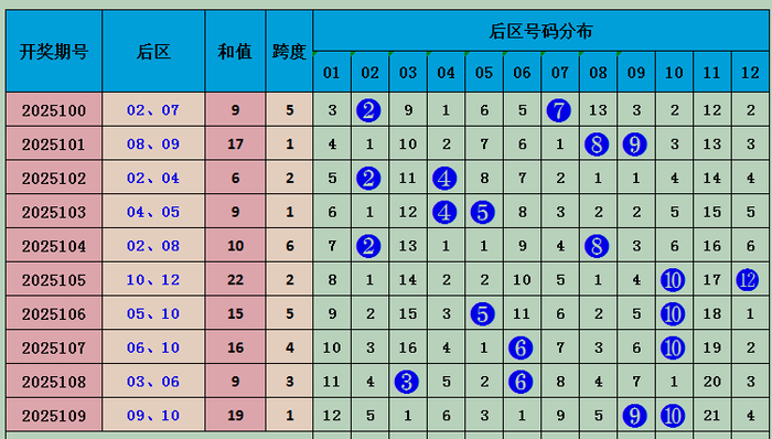 上期后区开出号码09 10,和值19,近十期和值9 17 6 9 10 22 15 16 9 19,和值波动范围较大,本期预测和值会下降,重点关注号码:02 05,和值7。