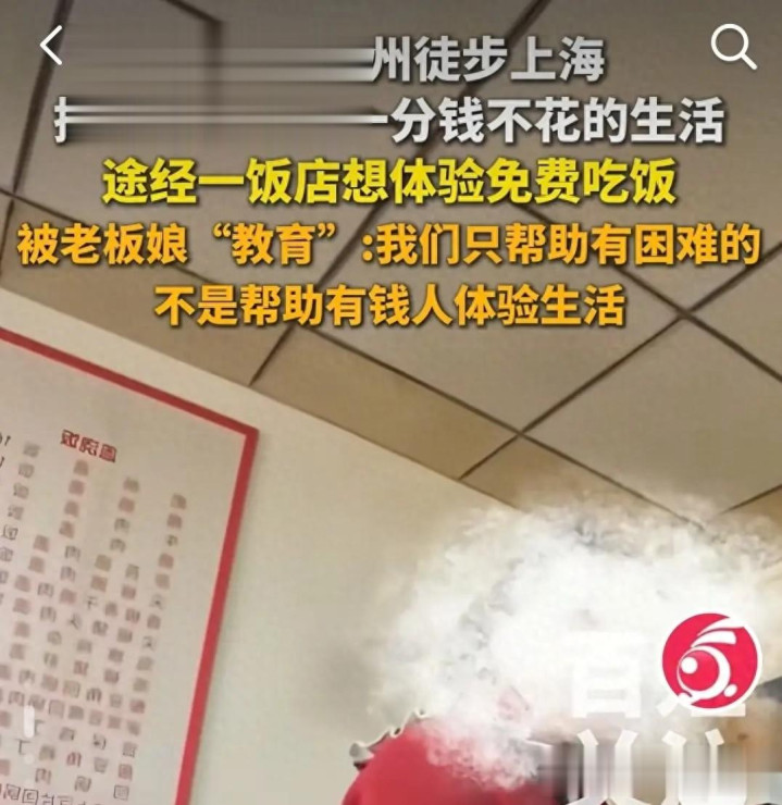 饭店老板娘一句“我们不帮有钱人体验生活”,撕下了这位徒步旅行者最后的遮羞布。“我们在帮真正吃不起饭的人,不是帮有钱人来体验生活的。”饭店老板娘这几句直白的回绝,配上“白嫖姐”愣住的表情,在短视频平台迅速传播发酵。事件起因是一位女子挑战从杭州徒步至上海,全程不花一分钱,吃喝全靠向陌生人“乞讨”,她美其名曰“体验生活”。遭到当众拒绝后,这位女子反而将视频上传网络,企图引导舆论指责饭店老板娘,却意外引发了全网对其行为的批评。