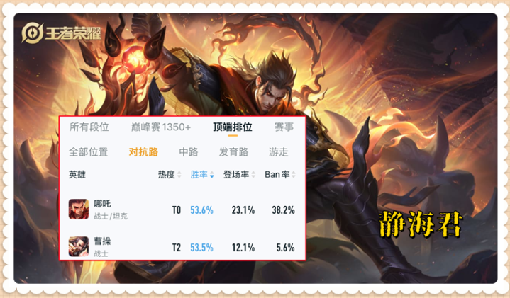 在顶端局,哪吒的胜率是53.6%,比曹操高0.1%;出场率是23.1%,比曹操高11%;ban率是38.2%,比曹操高32.6%。