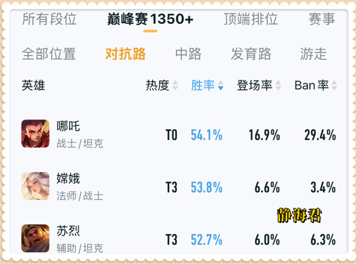 巅峰赛里的哪吒不光胜率远超曹操,就连出场率和ban率也呈碾压的态势,所以我才敢在标题中说强如曹操也比不上哪吒。