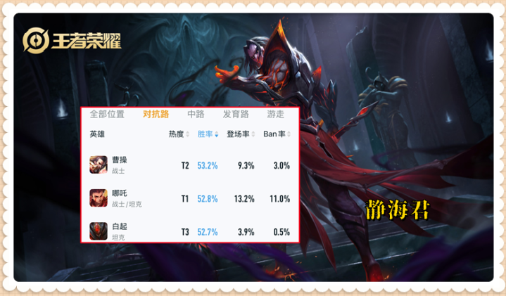 关于这一点,全段位的数据足以说明一切:在全段位哪吒的胜率是52.8%,确实比曹操低了一点,但是其出场率比曹操高了3.9%,ban率比曹操高了8%,综合来看肯定不比曹操差。